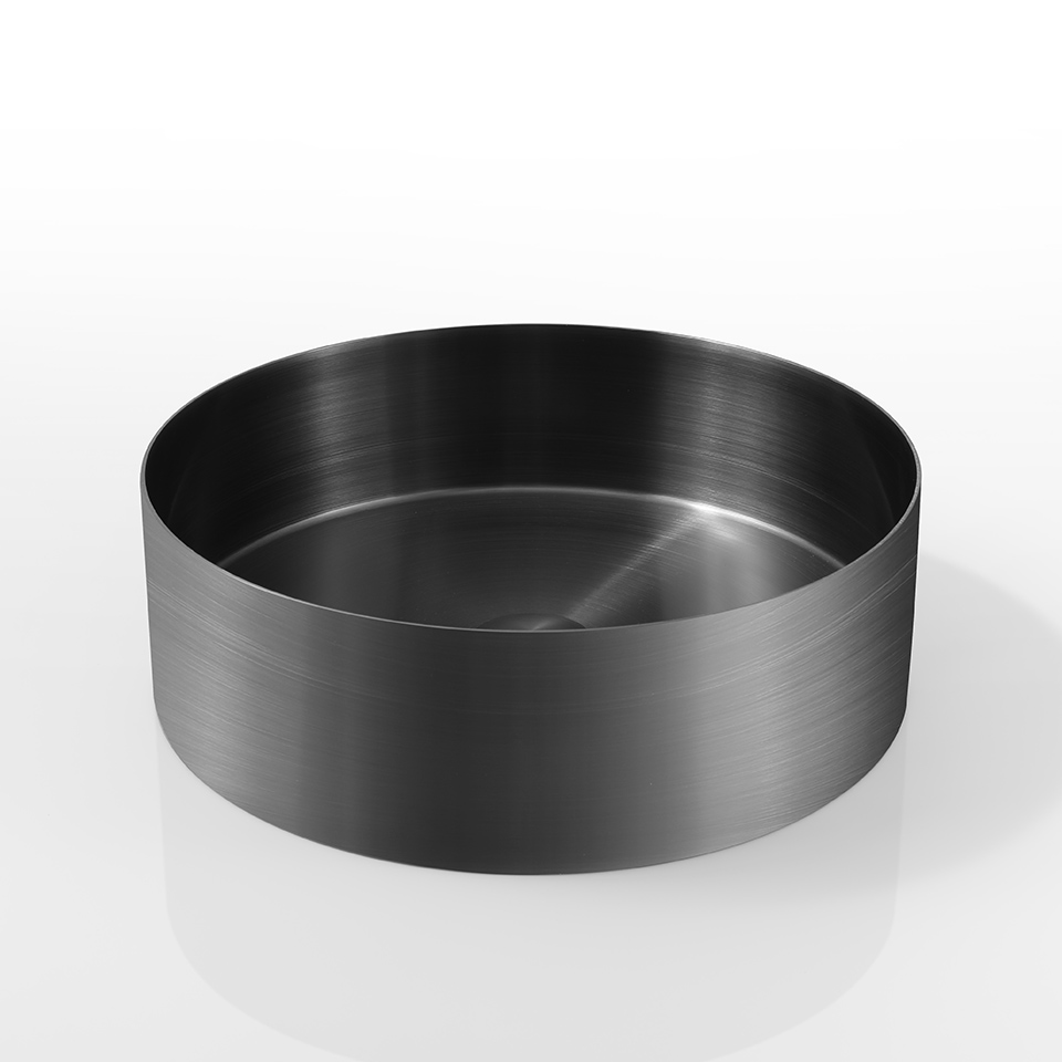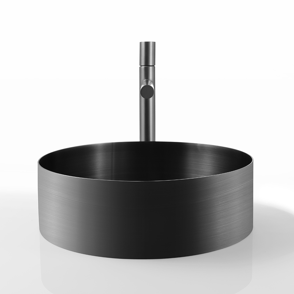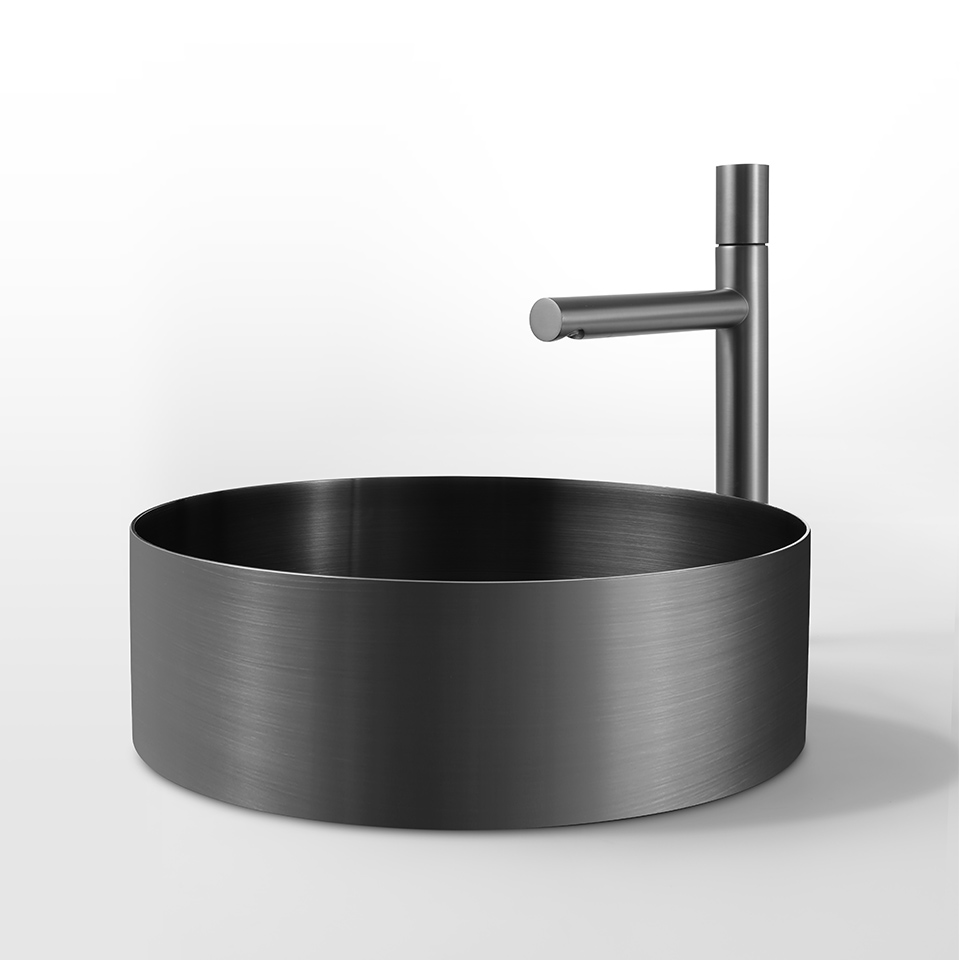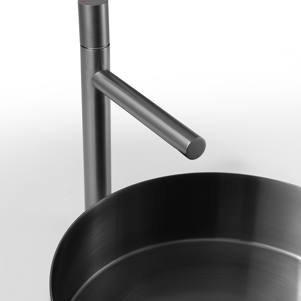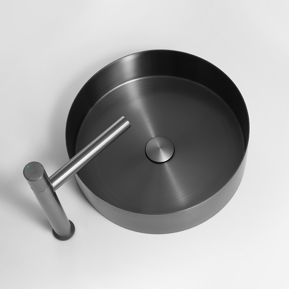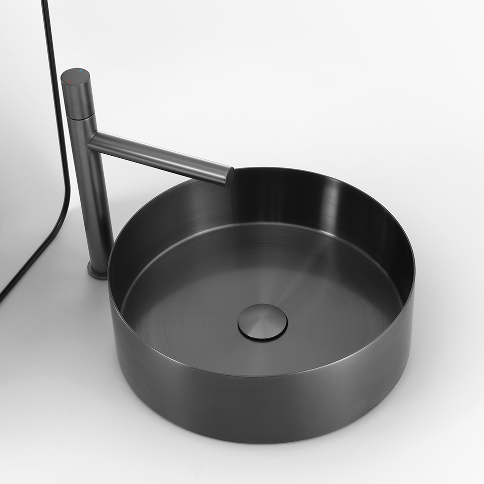 Lavoarul Marigold din oțel inoxidabil, montat pe blat, se remarcă prin designul său minimalist și nuanța specială Gun Grey, devenind un element central distinctiv al băilor contemporane.